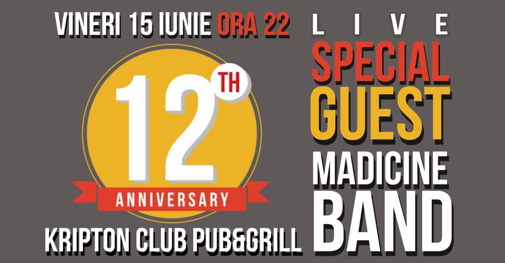 Party at our house!!!!!! Kripton împlinește 12 ani de la înființare. 12 ani cu petreceri de neuitat, 12 ani cu muzica bună, invitați speciali, mii de shot-uri și mii de ore de distracție. Pentru că toate astea nu ar fi fost posibile fără voi, vă invităm pe 15 iunie începând cu ora 22 00, să sărbătorim împreună acest eveniment alaturi de invitații noștri speciali –MADICINE BAND din Serbia, care promite un concert de zile mari!