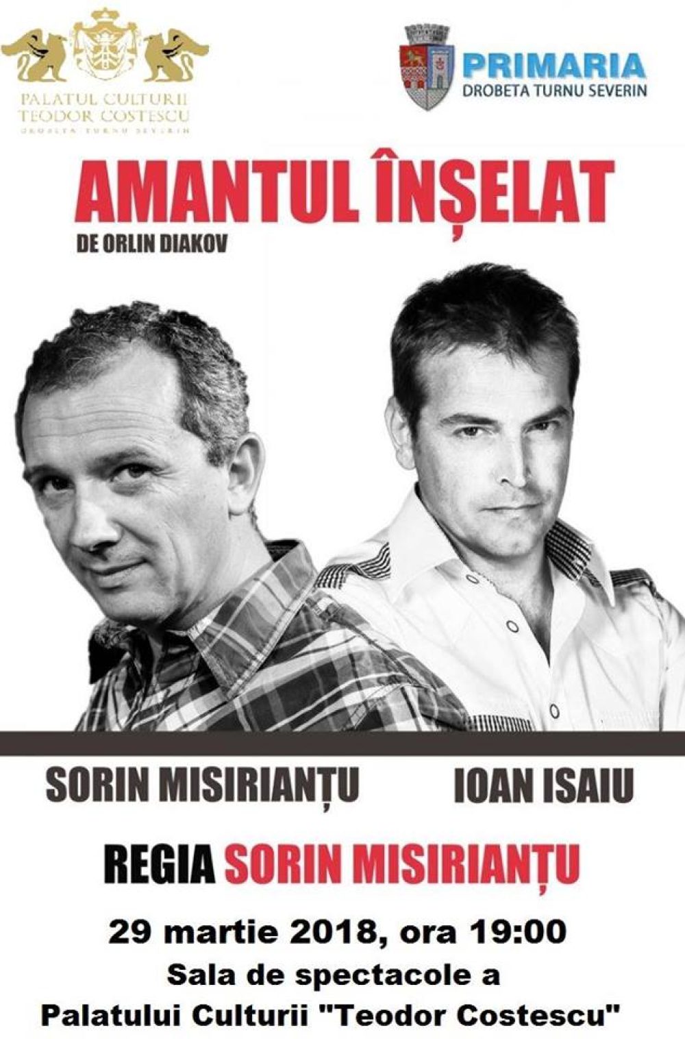 ”Amantul Înșelat,, este o comedie a la Tarantino, plină de umor, peripeții, dar și momente reale din viață. O piesă de teatru care abordează lupta dintre doi bărbați pentru femeia iubită. Fără reguli, fără scrupule, cu bătăi și îmbrânceli ,,Amantul înșelat” așterne în fața spectatorilor o poveste năucitoare, despre doi bărbați îndrăgostiți de aceeași femeie. Nu ratați un eveniment unic, interpretat de actorii Ioan Isaiu și Sorin Misirianțu. Vă așteptăm cu drag la Palatul Culturii Teodor Costescu din Drobeta Turnu Severin pentru a fi martorul celei mai frumoase piese de teatru.