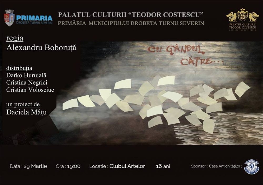,,Cu gândul către” este o minunată piesă de teatru ce spune povestea cutremurătoare a destinului unui scriitor. În regia lui Alexandru Boboruță, piesa vine în premieră la Dr.Tr.Severin și trebuie neapărat să o vezi.