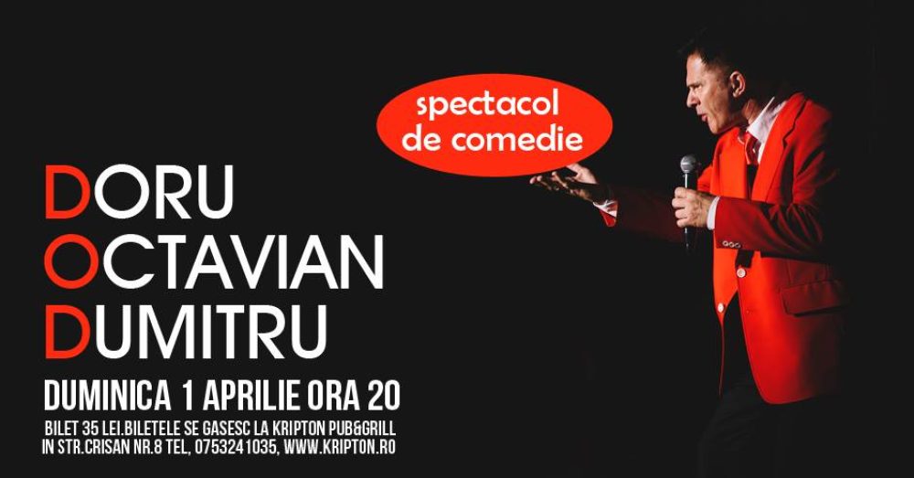 Comedia autentică ajunge la Kripton Club Pub&Grill, duminică 1 aprilie, ora 20:00, cu un nou spectacol de zile mari, cum numai Doru Ocatvian Dumitru știe să facă. Vino cu gașca și fi martor la scrierea unei noi file din istoria comediei autentice românești.