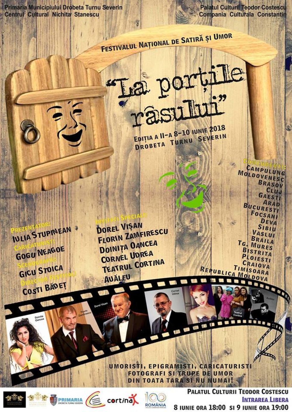 Vino și tu la Festivalul național de satira și umor ”La porțile râsului,, ce va avea loc la Palatul Cultural Teodor Costescu, din Drobeta Turnu Severin, de pe 8 până pe 9 iunie. Festivalul se adresează tuturor trupelor și interpreților de umor, amatori din țară. Este singurul eveniment de acest gen din Oltenia, așadar nu rata un spectacol de excepție. Intrarea este liberă!!!!!