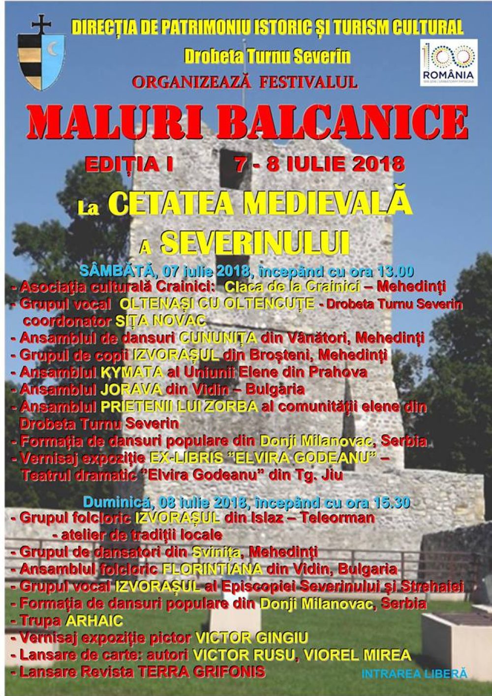 Pe data de 7-8 Iulie 2018, în cadrul Festivalului Intercultural Balcanic – Maluri Balcanice, ediție princeps – 12 ansambluri din Serbia, Bulgaria, greci din România și grupuri de artiști din comunități tradiționale din România, vor încânta publicul severinean cu muzică specifică și manifestări culturale impresionante.