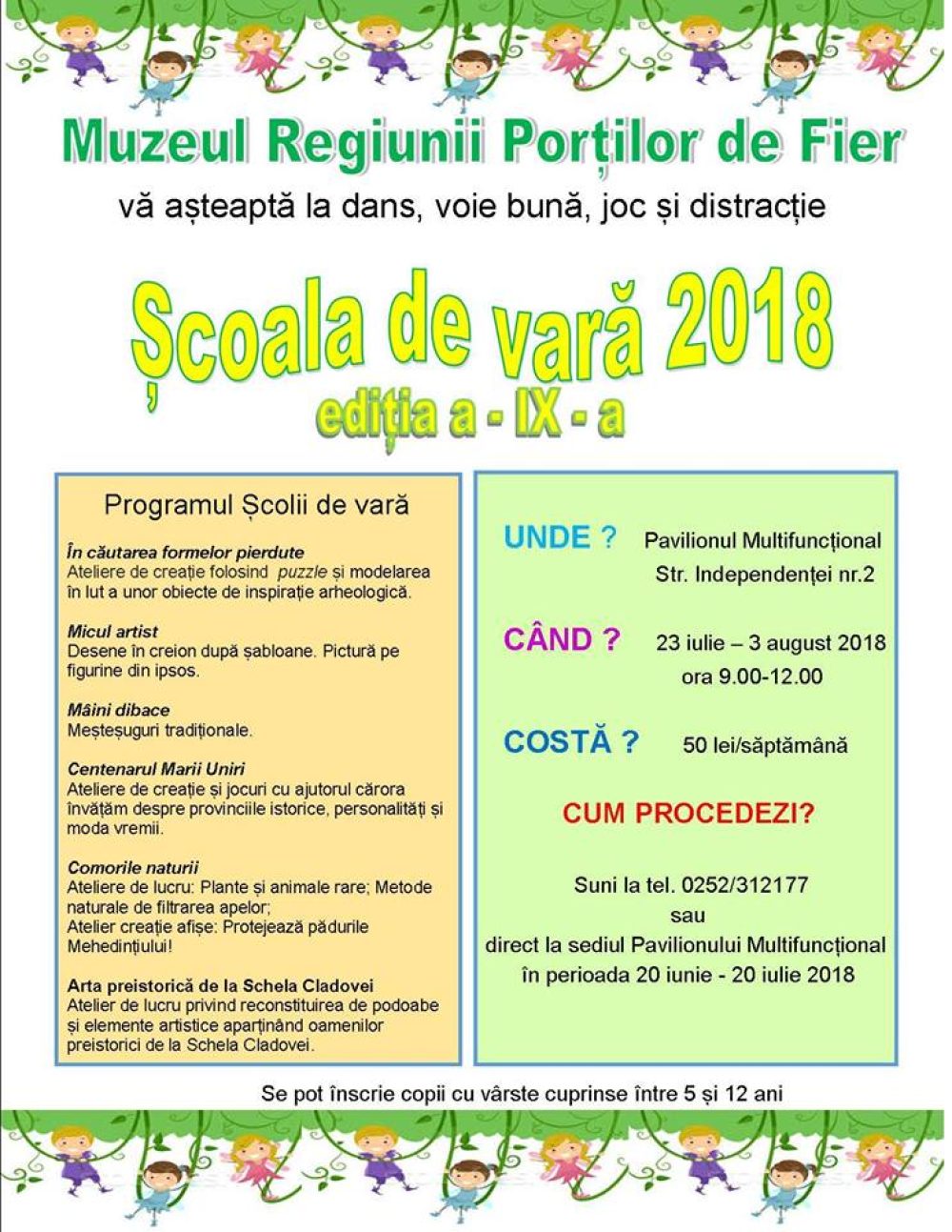 Anul acesta Muzeul Regiunii Porților de Fier vă așteaptă la ,, Școala de Vară 2018”, eveniment ajuns deja la a IX-a ediție. Toți copii cu vârste cuprinse între 5 și 12 ani sunt așteptați de pe data de 23 Iulie la cea mai frumoasă experiență a anului.
